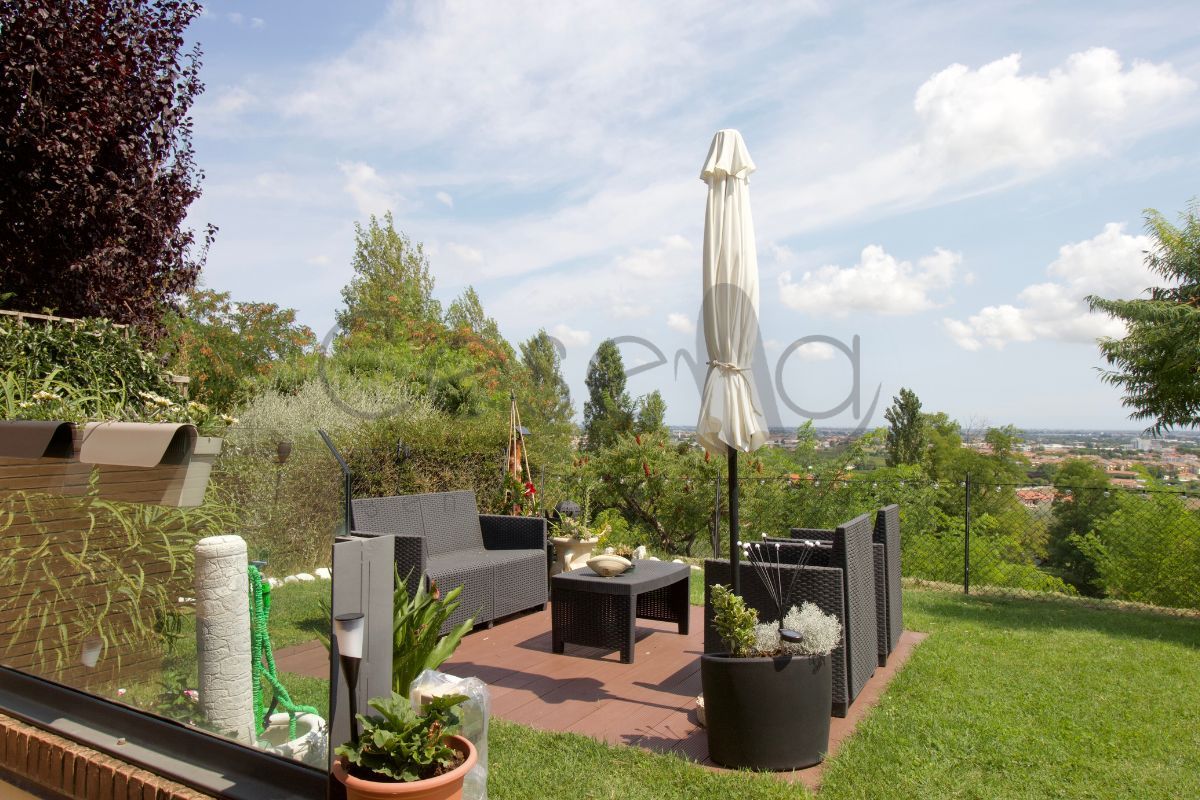 All’ingresso, grande spazio unico con accesso diretto al giardino con vista panoramica, più il primo bagno.